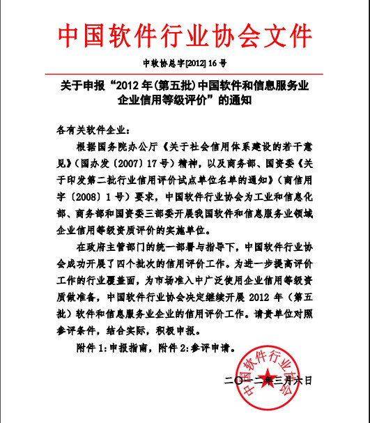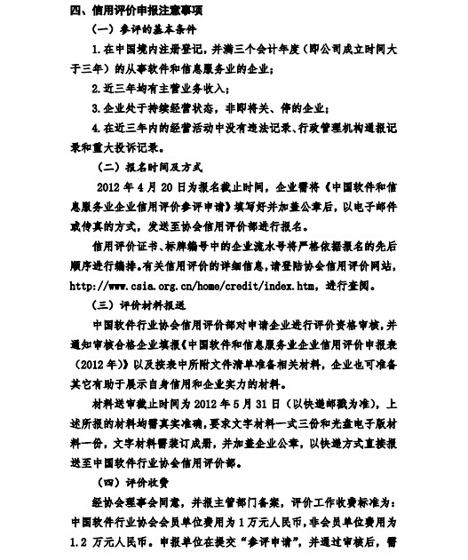关于申报“2012年(第五批)中国软件和信息服务业企业信用等级评价”的通知