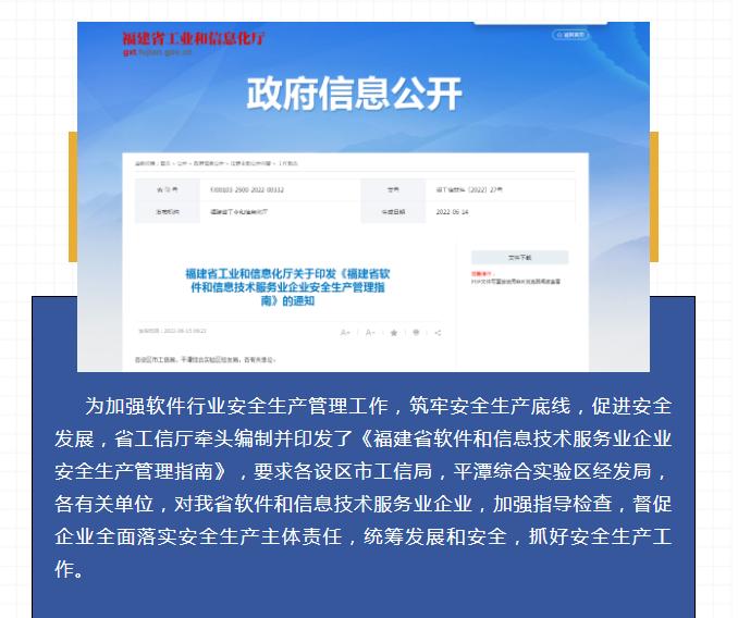 为深入贯彻习近平总书记关于安全生产工作的重要指示批示精神,认真落实《中华人民共和国消防法》《中华人民共和国安全生产法》《福建省安全生产条例》《福建省消防条例》《福建省党政领导干部安全生产责任制实施细则》《福建省消防安全责任制实施办法》《福建省安全生产“党政同责、一岗双责”规定》等有关要求,加强软件和信息技术服务业企业(以下简称“软件业企业”)安全生产工作,制定本指南(以下简称“《指南》”)。