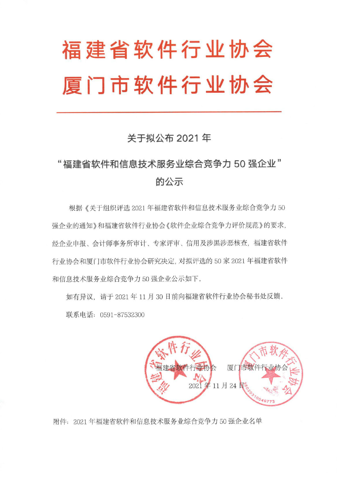 关于拟公布2021年“福建省软件和信息技术服务业综合竞争力50强企业”的公示